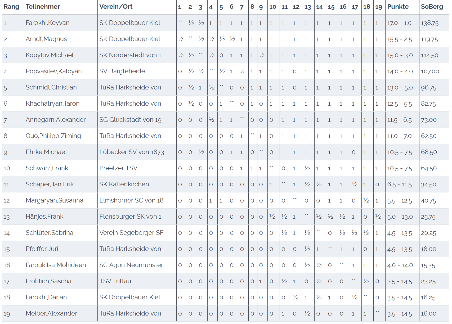 Insgesamt steht ein wichtiger und verdienter 4:2 Sieg. Im Fernduell gegen Hamburg verlieren wir weiter und sind jetzt 5 Brettpunkte hinter Hamburg, die heute gegen sehr schlecht aufgestellte Harksheider 6:0 gewannen (alle Ergebnisse hier). Viele Spieler spielen aktuell auch das Turnier in Bad Zwischenahn. Unter anderem sind zwei der Kieler Jugendspieler dabei. Alexander spielt ein herausragendes Turnier mit einem Sieg gegen 2277, Katerina konnte dem Harksheider Brett 1 Philipp Ziming Guo ein Remis abnehmen.